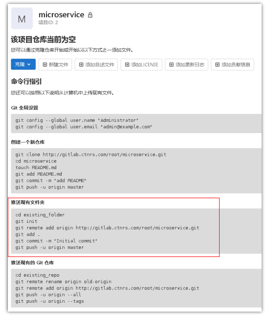 在Gitlab创建一个项目,然后提交微服务项目代码。